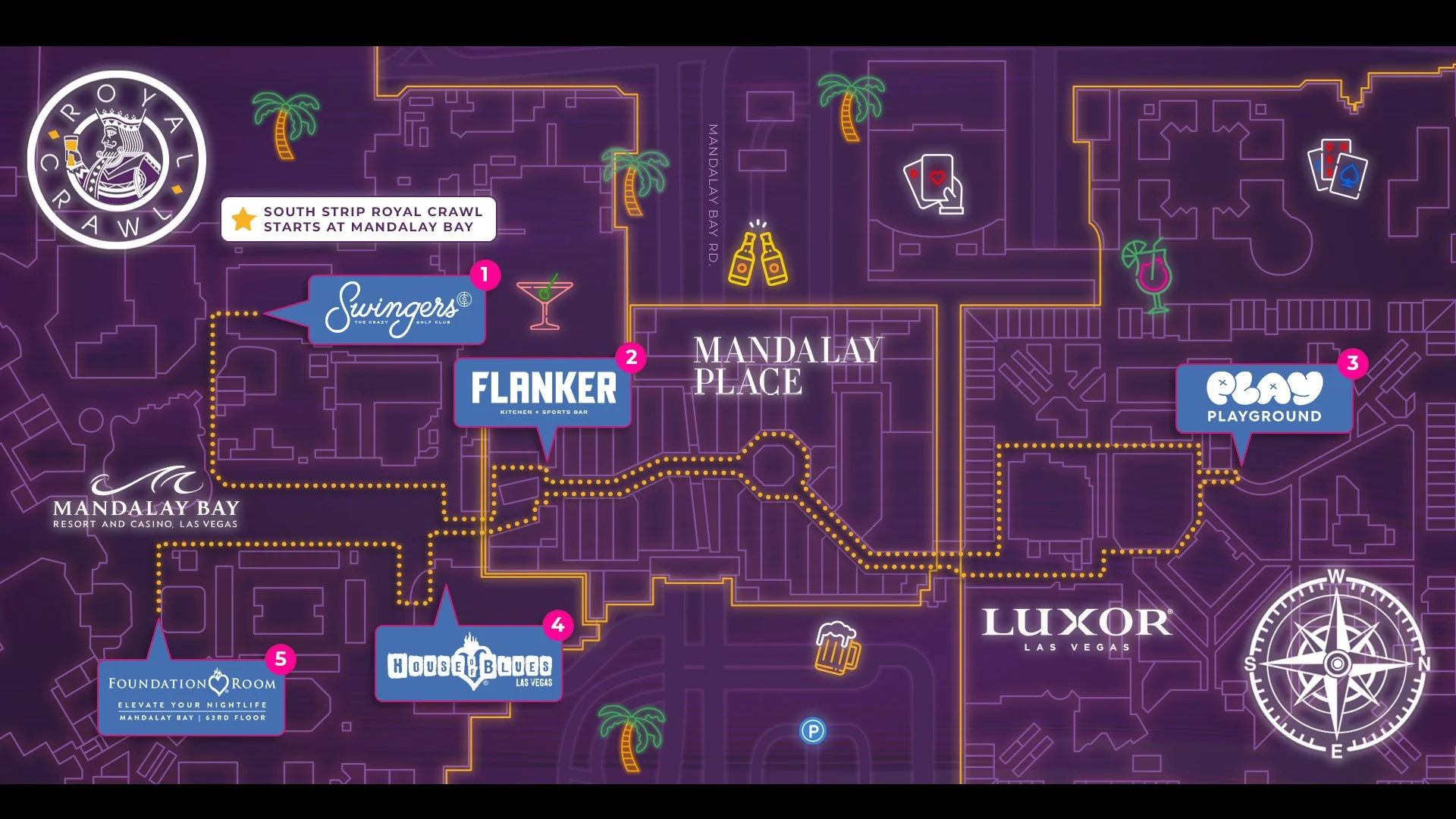 Welcome to the South Strip Bar Crawl! Kickstart your night by walking the world-famous Las Vegas Strip while drinking at 5 different bars and playing a bar crawl poker game, all done through your smartphone. Visit the following Mandalay Bay and Luxor venues between 5 pm and 11 pm to collect your five-card virtual poker hand and get your drinks. Be sure to go to all 5 bars to get your drinks before 11 pm. Enjoy!